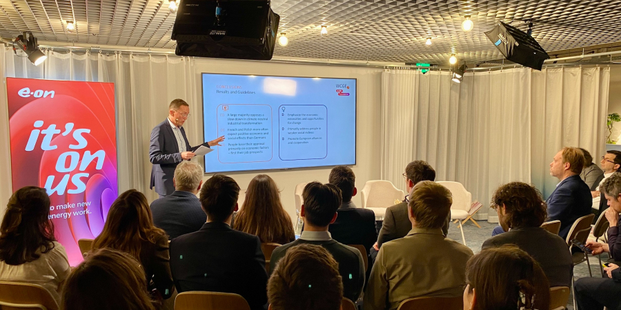 Wie blicken Beschäftigte aus Deutschland, Frankreich und Polen auf den klimaneutralen Umbau der Industrie? Anlässlich der Veranstaltung „Trust or Bust: Will Net-Zero Industries Thrive in Europe?“ präsentierte Dr. Martin von Broock die Ergebnisse der Studie "Sustainable Industry in Europe: Guidelines for a just Transformation", die das WZGE in Zusammenarbeit mit der E.ON Foundation durchgeführt hat.